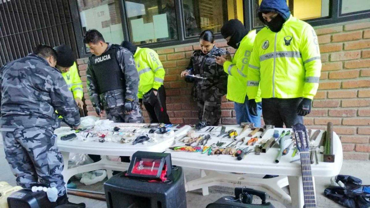 Parlantes, armas cortopunzantes artesanales, licor, droga y hasta una guitarra, fueron algunos de los objetos requisados en el interior del Centro de Rehabilitación Social de Turi, en Cuenca.