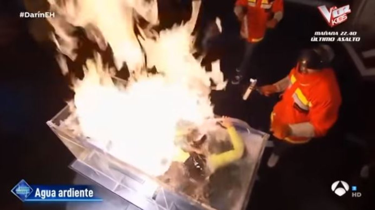 En el programa español ‘El Hormiguero’, emitido por Antena 3, un hombre casi se ahoga y ‘chamusca’ en pleno set.
