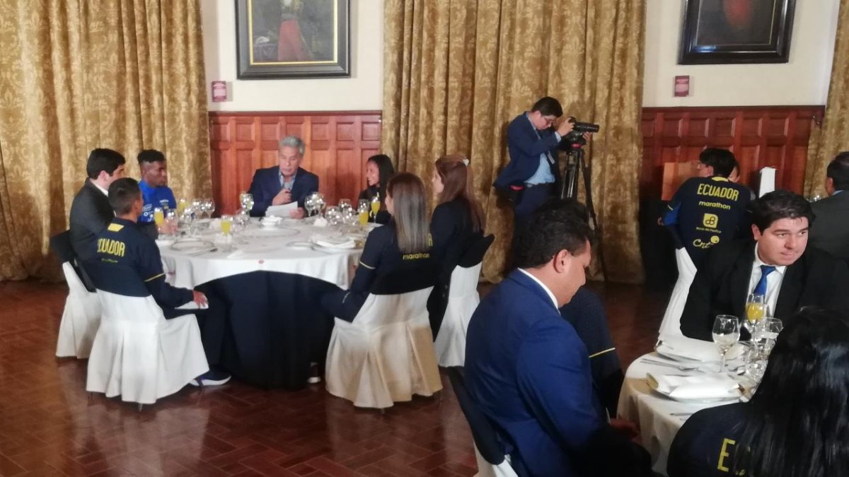 “Quiero agradecer por este gran gesto con los deportistas. Esto nos motiva para seguir logrando más triunfos para el país”, afirmó José Cifuentes, en nombre de los futbolistas y le entregó a Moreno una camiseta de la Tricolor con la que conquistaron la medalla de bronce en la Copa del Mundo.