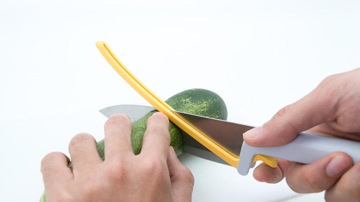 Dentro de los cinco utensilios está un cuchillo con protector de goma, este se coloca en ambos lados de utensilio, así el cocinero puede detectar dónde se encuentra el filo, antes de tocar y así evita un corte.