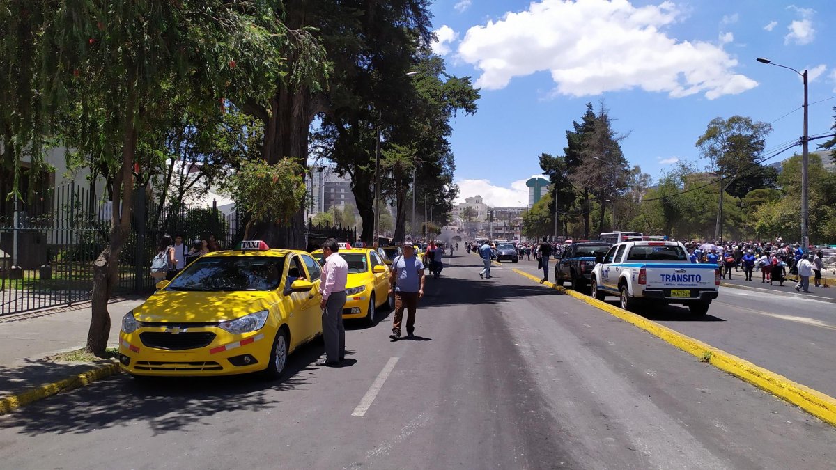 La mañana de este 14 de octubre una fila de taxis se ubicó en los alrededores de la Casa de la Cultura, a pocos metros del parque de El Arbolito, en donde se desarrolla una minga para limpiar los objetos que dejaron 12 días de protestas.