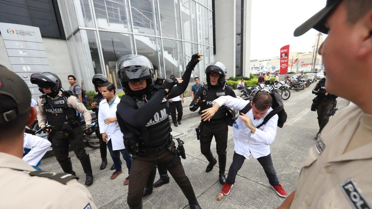 Gotas de sudor resbalan por la barbilla de Kevin Rosales. Sus manos y voz tiemblan. A su alrededor, cerca de 200 estudiantes de Medicina de diferentes universidades de Guayaquil, levantan carteles, aplauden y cantan consignas para rechazar la reducción en el pago de su internado rotativo.