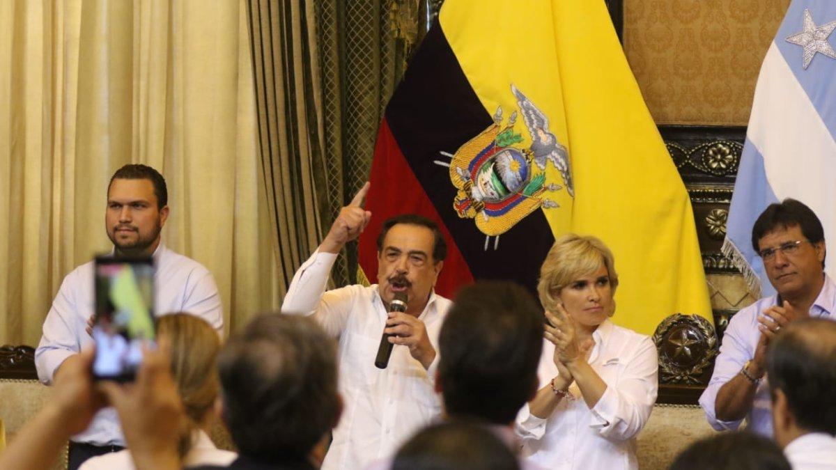 Su discurso duró más de 17 minutos. En los exteriores del Palacio Municipal de Guayaquil, los ciudadanos presentes se alborotaban cada vez que el exalcalde Jaime Nebot repetía la frase “defenderemos la libertad”.
