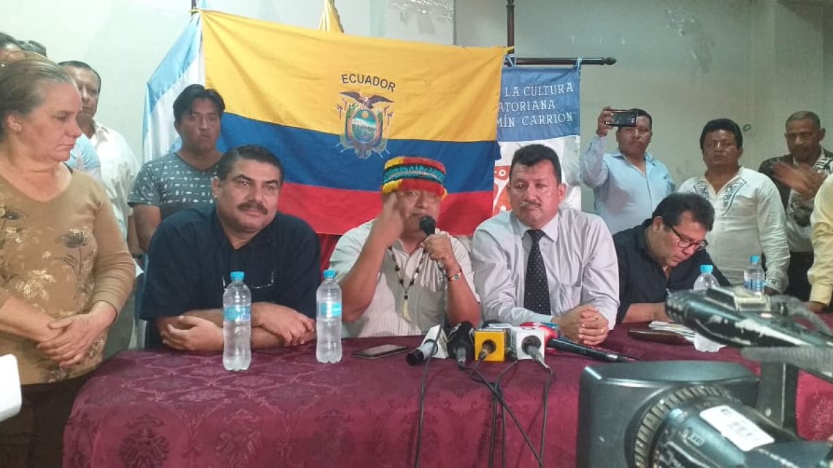 El acto se desarrolla en el quinto piso de la Casa de la Cultura núcleo del Guayas, en el centro de la ciudad, donde simpatizantes del líder indígena y dirigentes de movimientos sociales llenan el auditorio.