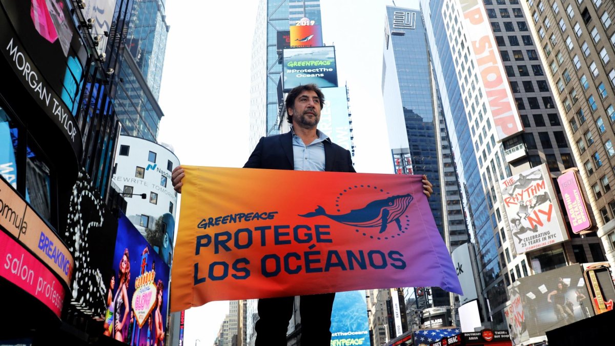 El actor español Javier Bardem y Greenpeace tomaron este lunes con una campaña publicitaria la céntrica Times Square en Nueva York, en la que el intérprete, embajador de esta organización, pidió a los Gobiernos un pacto mundial para la defensa de los océanos.