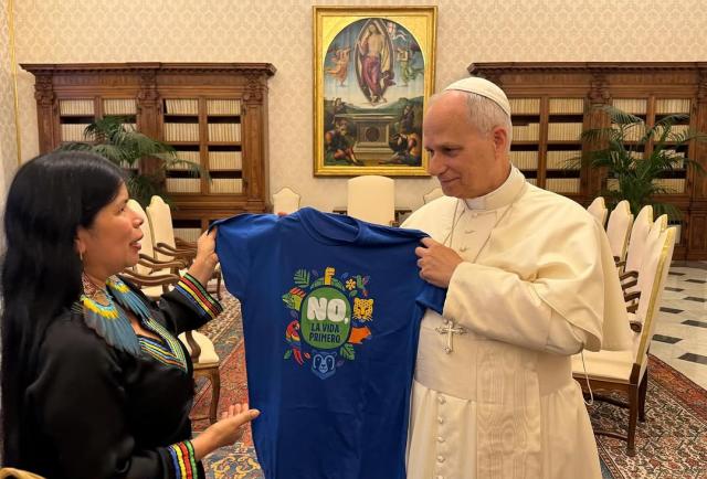 La activista indígena Patricia Gualinga se reunió con el Papa León XIV este 30 de octubre de 2025 en el Vaticano, a pocas semanas de la consulta popular en Ecuador. Durante la audiencia privada, Gualinga entregó al pontífice una camiseta azul con la palabra "No", en posible alusión a la campaña por la votación del próximo 16 de noviembre.