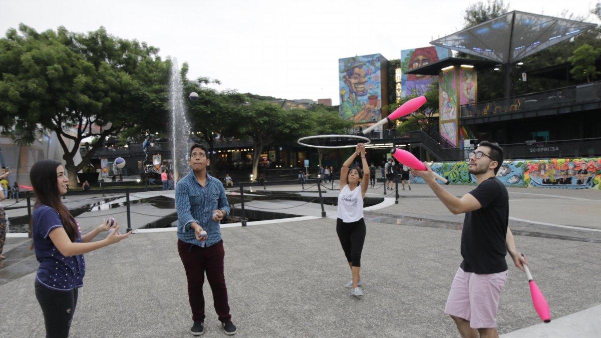 Las clavas de malabares fucsias de Bryan Bieder atraen a uno que otro visitante de la plaza Guayarte. El malabarista, de 27 años, acude cada miércoles a la plaza de las Artes, donde da cursos gratuitos de este arte, desde las 16:00 hasta las 19:00.