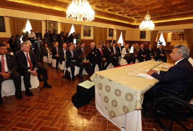 El presidente Lenín Moreno tuvo una reunión con el con el Cuerpo Diplomático acreditado en Ecuador para, entre otros temas, referirse a la situación que enfrenta el país con respecto al narcotráfico y secuestro de periodistas.