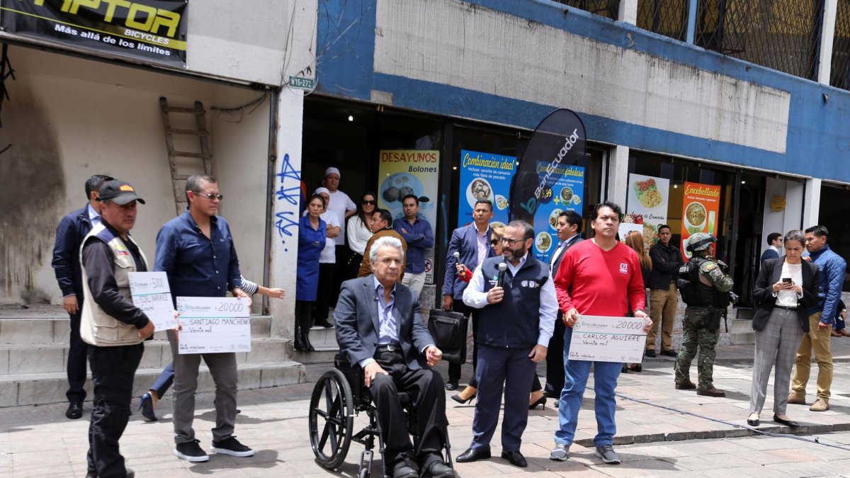 En la esquina de 6 de Diciembre y Tarqui, epicentro de la violencia, el olor acre de los incendios y el remanente de gas lacrimógeno en el aire todavía provocan picazón en la nariz y ardor en la garganta, cuatro días después de los disturbios. Ahí, a la sombra del incendiado edificio de la Contraloría General del Estado y frente al parque de El Arbolito, el presidente Lenín Moreno cumplió ayer uno de aquellos actos simbólicos que el poder se reserva para enviar el mensaje de que todo está bajo control: recorrió la zona, constató los daños en los locales comerciales que fueron asaltados por los vándalos, prestó oídos a sus propietarios y les entregó ayudas por hasta 20 mil dólares en cheques de Banecuador. Entre una cosa y la otra, deslizó dos o tres declaraciones políticas para tener en cuenta.