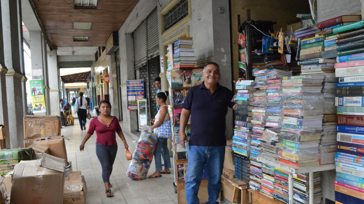 Jorge Loor, uno más del equipo, no tiene local y prefiere no estacionarse en la calle, sino que se pasea por los locales de sus amigos vendiendo libros que recicla en las ciudadelas, o que encuentra abandonados. Es el proveedor de los libreros.