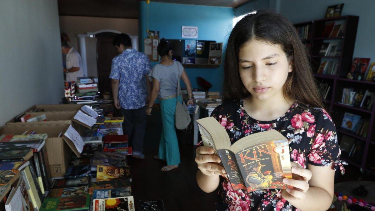 Gustavo León, estudiante universitario de 23 años, visitó la sede del colectivo Casa Morada en Urdesa, donde ayer se realizó un garaje de textos literarios que se venden e intercambian, una vez cada mes.