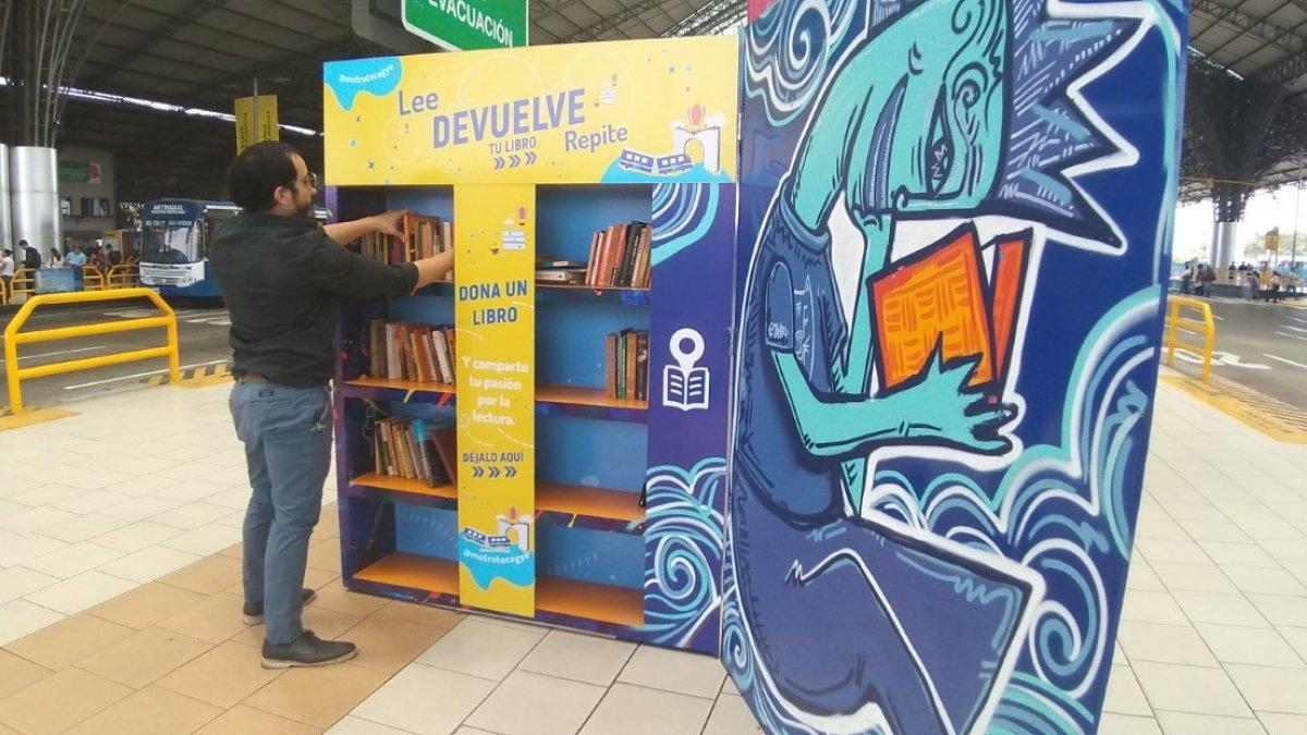 A Mateo Granizo, de 24 años, le llamó la atención llegar a la estación Río Daule de la Metrovía, ubicada frente a la terminal terrestre de Guayaquil, y toparse con decenas de libros que permanecían en una especie de librero de colores.