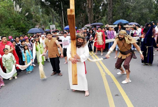 Bajo una lluvia perenne y los gritos de “camina, camina”; recibiendo azotes que estremecían, Marco Pintado carga una pesada Cruz de 16 quintales por un empinado camino de 7 kilómetros. Es el Vía Crucis viviente de la colina de Turi, que desde las 09:00 de este 19 de abril se cumple en Cuenca, como parte de la fe y religiosidad en conmemoración de Viernes Santo.