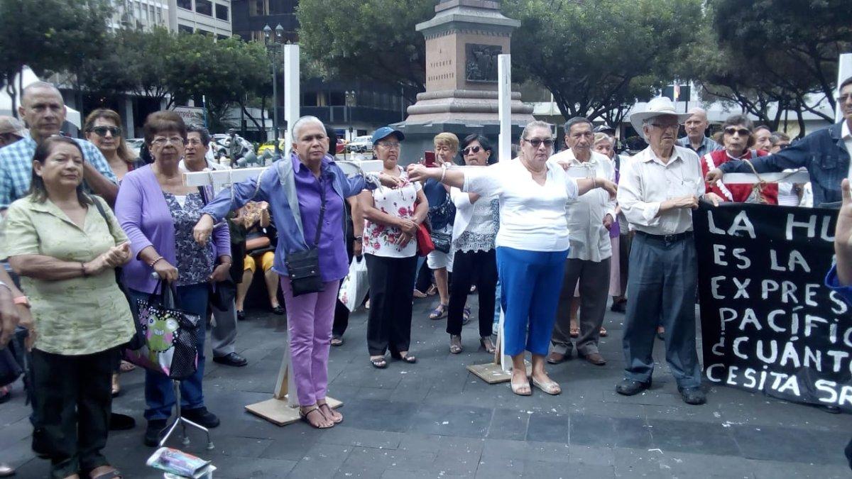 Un grupo de maestros jubilados de la provincia del Guayas realizó, este lunes 29 de julio, una crucifixión simbólica en la Plaza San Francisco de Guayaquil (9 de Octubre y Pedro Carbo). Ellos exigen el pago del incentivo jubilar que el Gobierno les adeuda desde el 2008 hasta el 2010 y desde el 2015 hasta el 2019, cuyo monto asciende 900 millones de dólares.