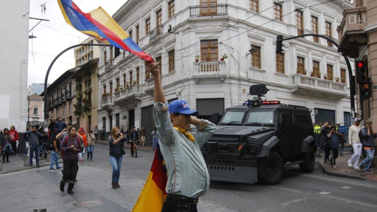 A esto se sumó la marcha de los estudiantes y trabajadores de la Universidad Central, que con banderas, cornetas y pancartas avanzaban al Palacio de Carondelet.