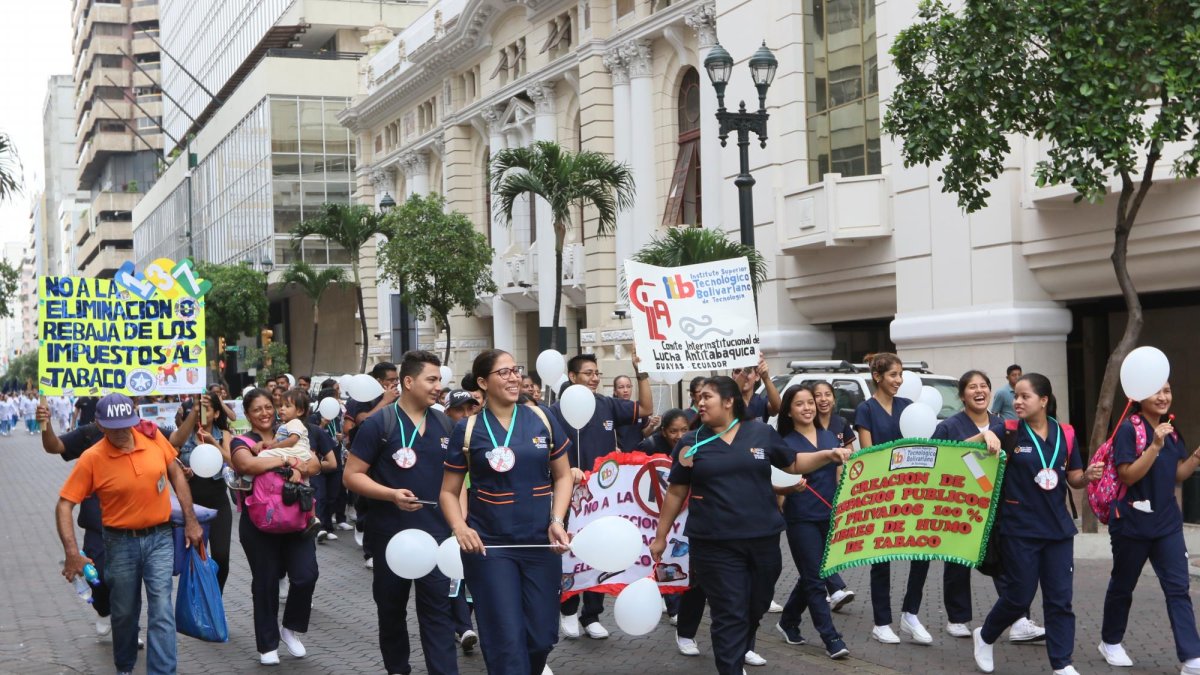 El punto de encuentro fue el Parque Centenario. Allí se dieron cita alumnos del Instituto Tecnológico Bolivariano, miembros y estudiantes de Auxiliar de Enfermería del Colegio de Médicos del Guayas, varios colegios de la ciudad, entre otros, con carteles, afiches y disfraces.