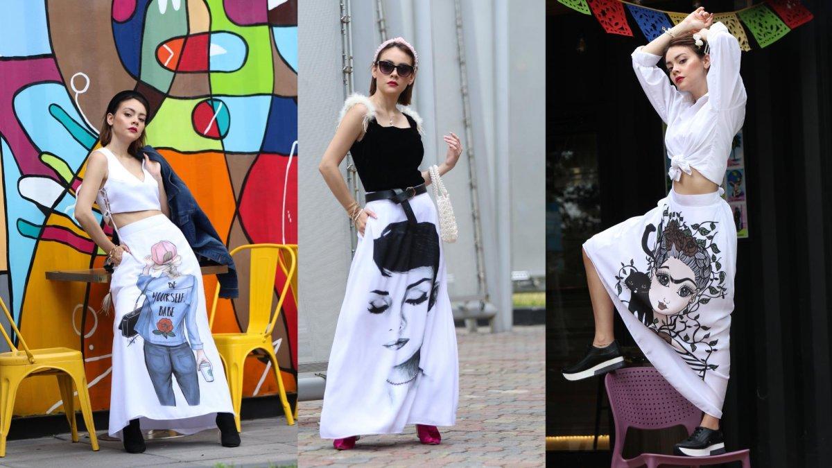 Un aspecto que todos los diseños tienen en común, es que realzan la fuerza de la mujer y amor por lucir siempre a la moda. Por eso, entre las ilustraciones que más destacan están las imágenes de Frida Kahlo y Audrey Hepburn. Franco explica que las maxi faldas están hechas en telas como el chifón y seda, y otro de los detalles que las hacen únicas es que logran una esencia de exclusividad al tener elementos sobrepuestos como perlas y plumas que dan la sensación de tridimensionalidad.