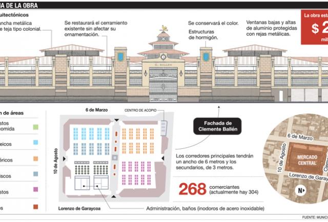 De lo que se conoce, del Central no quedará más que la fachada. Está previsto un cambio interno que replantea totalmente el orden actual de los comerciantes y separa de forma armónica proteicos, abastos, mariscos y demás productos, con pasillos principales de seis metros de ancho, como lo exige la norma técnica municipal, anota el administrador de la obra, Danny Almendáriz.