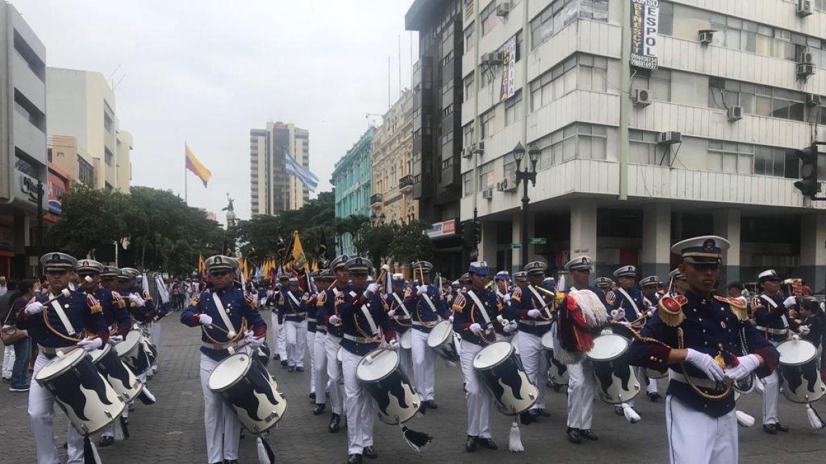 El Liceo Naval abrió el desfile, que este año se desvió por la calle Vélez y no por la avenida 9 de Octubre, debido a la construcción de la Aerovía. Luego continuó por Pedro Moncayo, para luego pasar por la 9 de Octubre hasta la Rotonda.