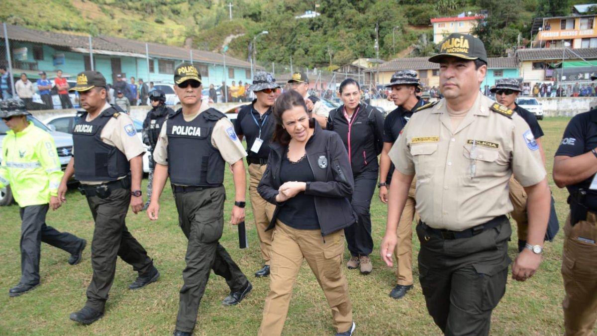 La ministra del Interior María Paula Romo se subió a un todoterreno de la Policía y se desplazó a la ciudad de plástico a verificar la situación del lugar en el que cientos de personas se dedicaban a actividades relacionadas con la minería ilegal. La Policía les proporcionó un chaleco antibalas.