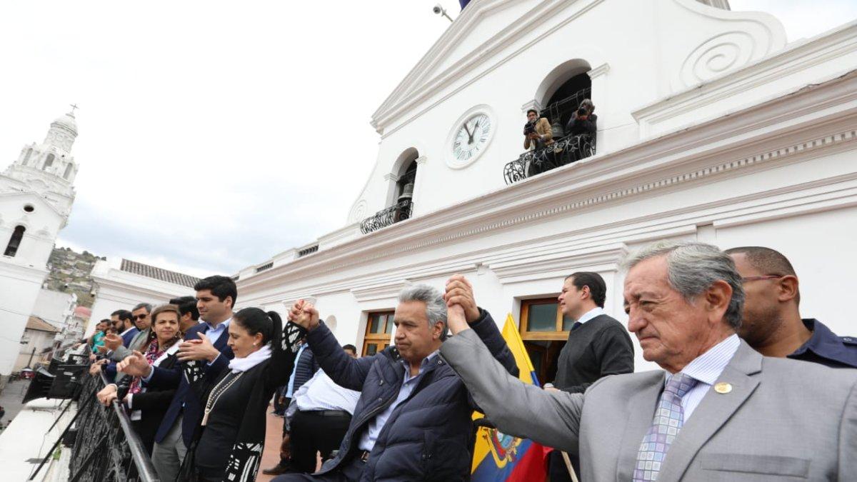 El mandatario estuvo acompañado de su esposa, Rocío González; el vicepresidente Otto Sonnenholzner; los ministros de Gobierno, María Paula Romo y de Defensa, Oswaldo Jarrín con quien incluso levantó las manos en señal de triunfo.