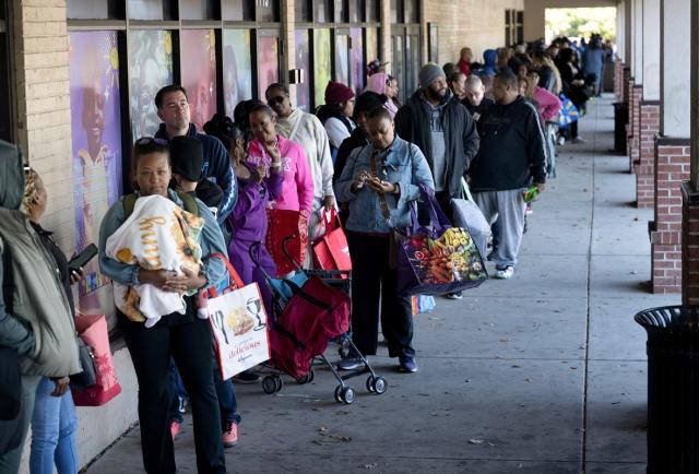 A su lado, cientos de empleados federales, asfixiados económicamente por el bloqueo presupuestario en Estados Unidos, hacen fila frente a una distribuidora de ayuda alimentaria.
