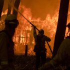 OROVILLE. Un bombero observa impasible cómo las llamas se elevan sobre su camión en el incendio en esta ciudad californiana la noche de este miércoles.