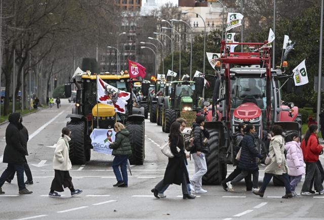 Miles de agricultores y ganaderos y cientos de tractores tomaron este miércoles, 11 de febrero de 2026, el centro de Madrid en una protesta contra el acuerdo entre la Unión Europea y Mercosur, que, afirman, traerá "competencia desleal" y amenaza a "la soberanía alimentaria".