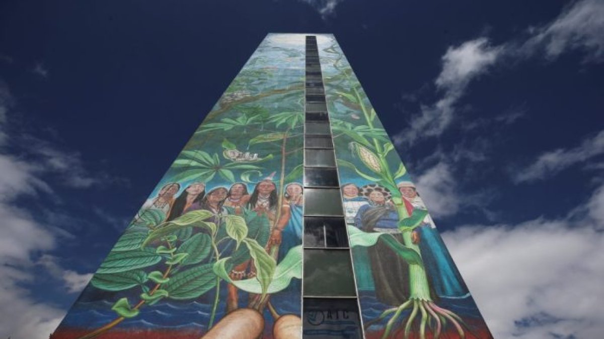 Seis mujeres de nacionalidades amazónicas y tres andinas aparecen retratadas con sus atributos característicos en un mural de 50 metros en un edificio de Quito, para recordar a los viandantes que son custodias de la naturaleza.