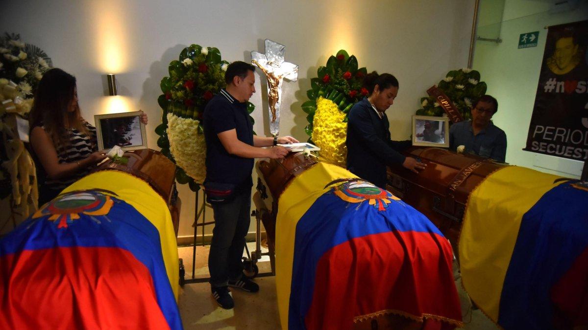 Los féretros de los tres integrantes del equipo de prensa secuestrado en la frontera y asesinado en Colombia se instalaron en una iglesia capitalina donde se lleva a cabo un velatorio público.
