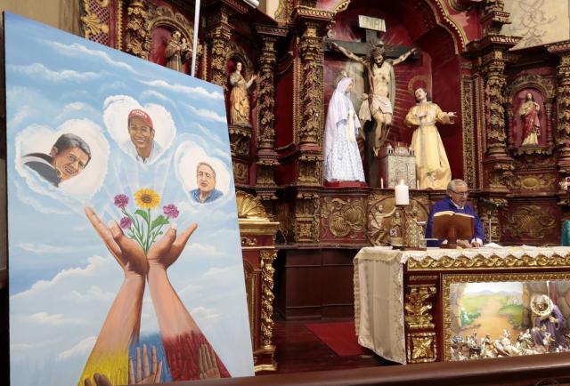 Luego, escuchan la palabra. Se dan la paz. Comulgan. Y Alfredo Lagla, presidente de la Sociedad de Cronistas, para concluir, recita unas frases que se hacen eco de la labor periodística en el país: “Buscaban la verdad y, a cambio, entregaron su vida”. Una frase dolorosa. “Ellos murieron por decir la verdad; murieron trabajando”, concluye Lagla desde el altar. Al final, entregan unos botones con las fotos de los tres y caminan hacia la exposición de su trabajo en la Casa de la Cultura.