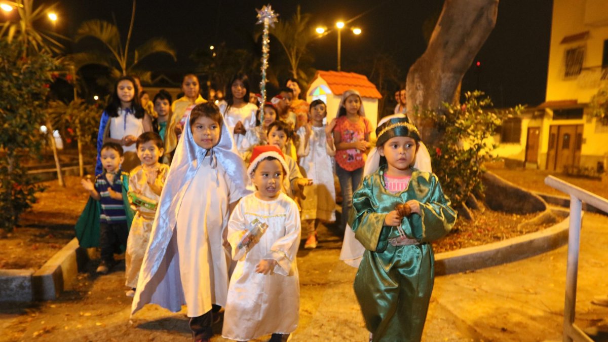 Los niños que usualmente juegan en ese espacio público dejan el columpio y la resbaladera para recrear el acontecimiento, vestidos de pastores, reyes magos y de José y María, los padres de Jesús. Luego realizan una alegre caminata hasta la casa de uno de los vecinos.