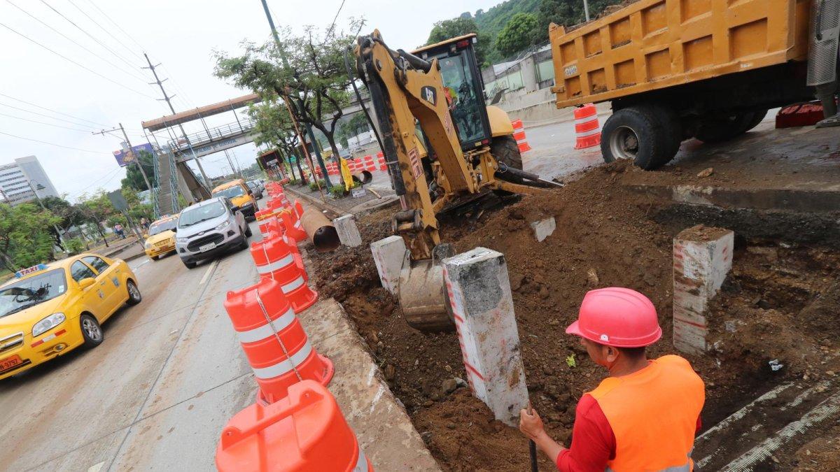 Labores de cimentación se efectúan en un tramo del parterre central de la avenida del Bombero, en Los Ceibos. La intervención se ejecuta a 20 metros del paso peatonal elevado, cuya estructura quedó afectada el pasado 8 de agosto por el impacto de una plataforma que trasladaba una retroexcavadora.