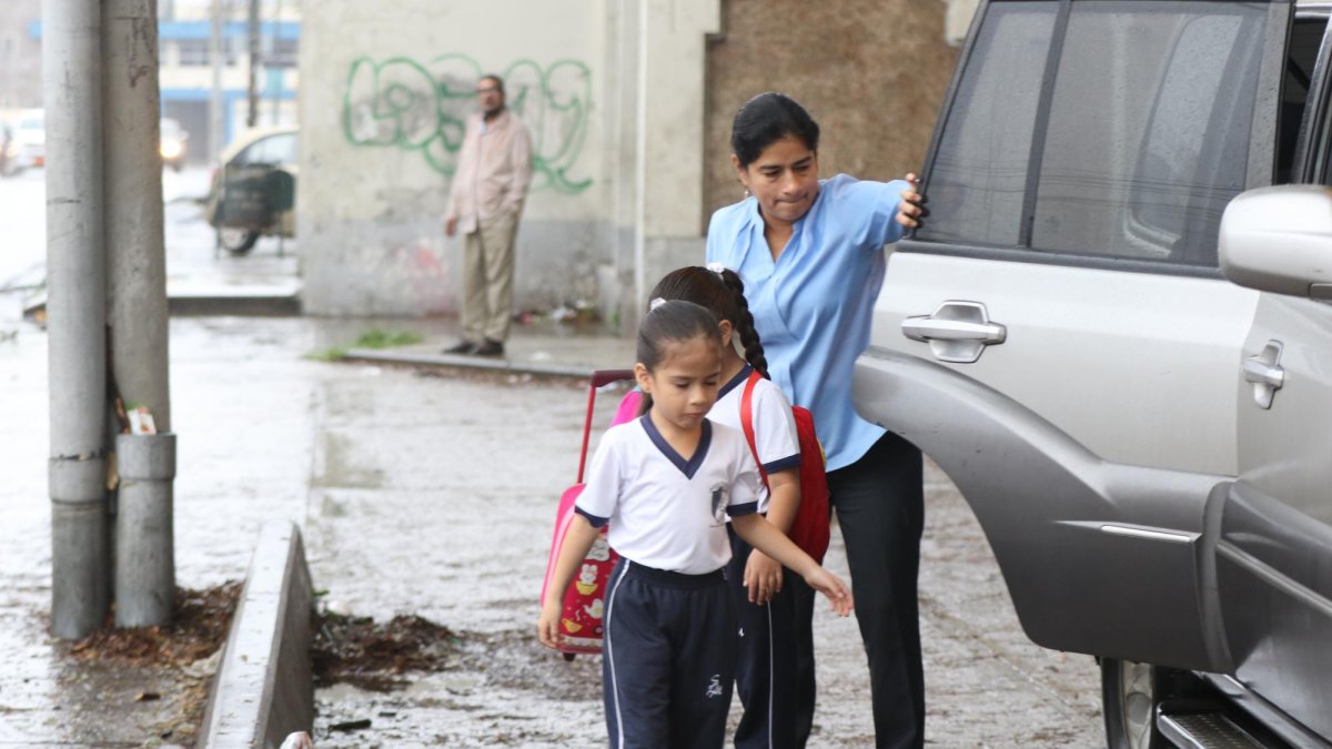 La pareja de esposos se turna para llevar al más pequeño de la casa hasta la Unidad Educativa Santiago de las Praderas (Uespra), en La Pradera I. En esta ocasión le tocó a Ivón, quien con un paraguas trataba de evitar que el aguacero que caía en ese momento mojara a su niño.