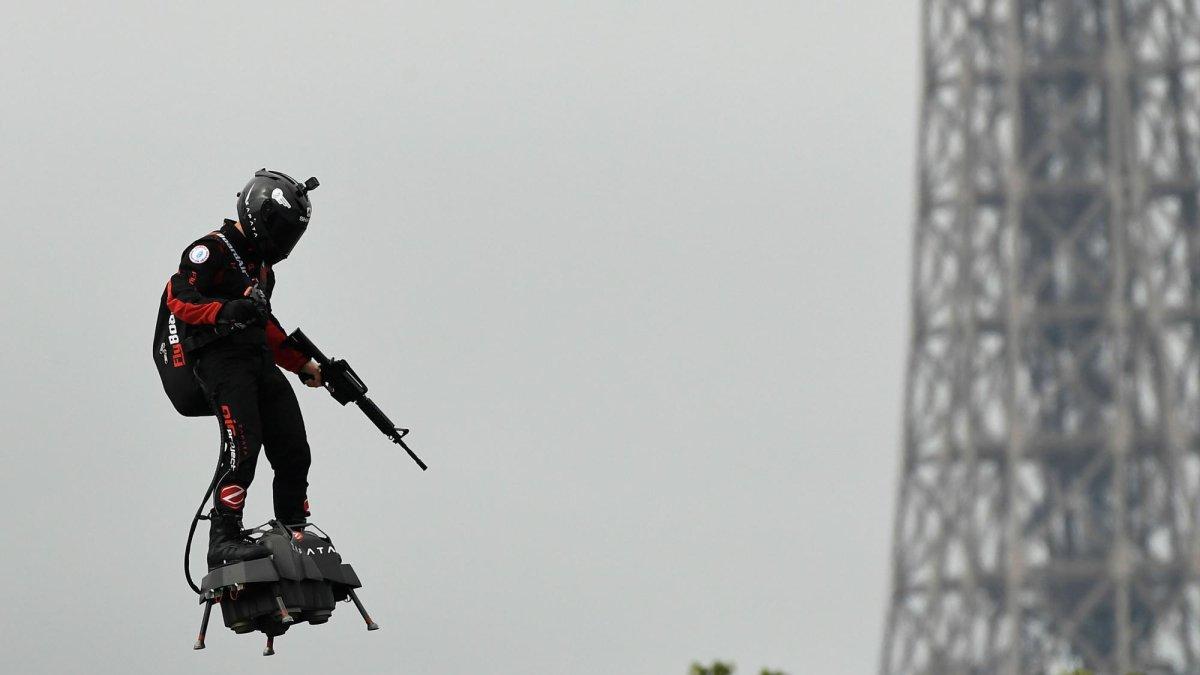 El campeón de jet-ski se robó el show del Día Nacional de Francia, al sobrevolar París en su plataforma volante.