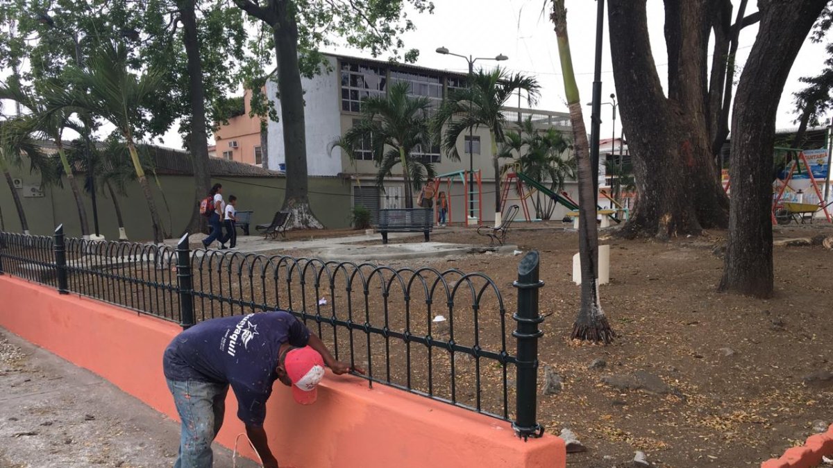 Trabajadores del Municipio de Guayaquil pintaban este miércoles las paredes y bordes del parque ubicado entre las manzanas 602 y 603 de la VI etapa de la ciudadela Alborada, en el norte de Guayaquil. La obra respondía a los últimos toques de la minga del pasado lunes, de limpieza y mantenimeinto en esa área de recreación, que hicieron también trabajadores enviados por el Municipio.