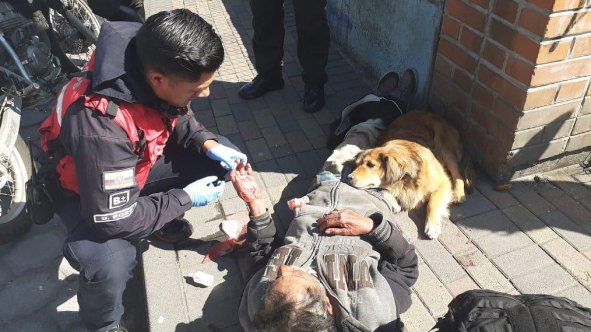 Según el Cuerpo de Bomberos de Quito, fue necesario calmar primero al ‘animalito’ para acceder a las heridas del hombre que aparentemente tuvo una fuerte caída y que está en situación de calle.
