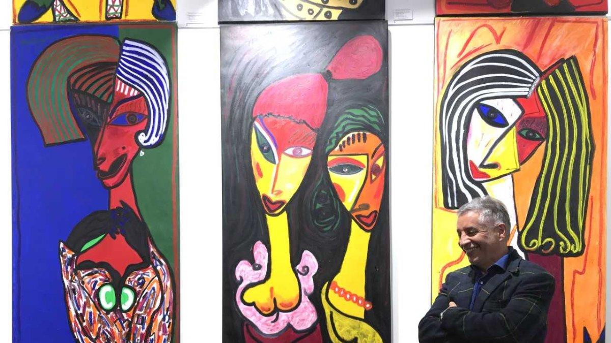 Las pinturas, de 1,80 metros de alto, se caracterizan por los colores fuertes y los gestos “picasianos”, que según el autor no fueron intencionales. “El verano pasado estuve en el museo Reina Sofía (Madrid) y vi las obras de Picasso, y me entusiasmé muchísimo, supongo que de ahí surgió la coincidencia”, resalta.