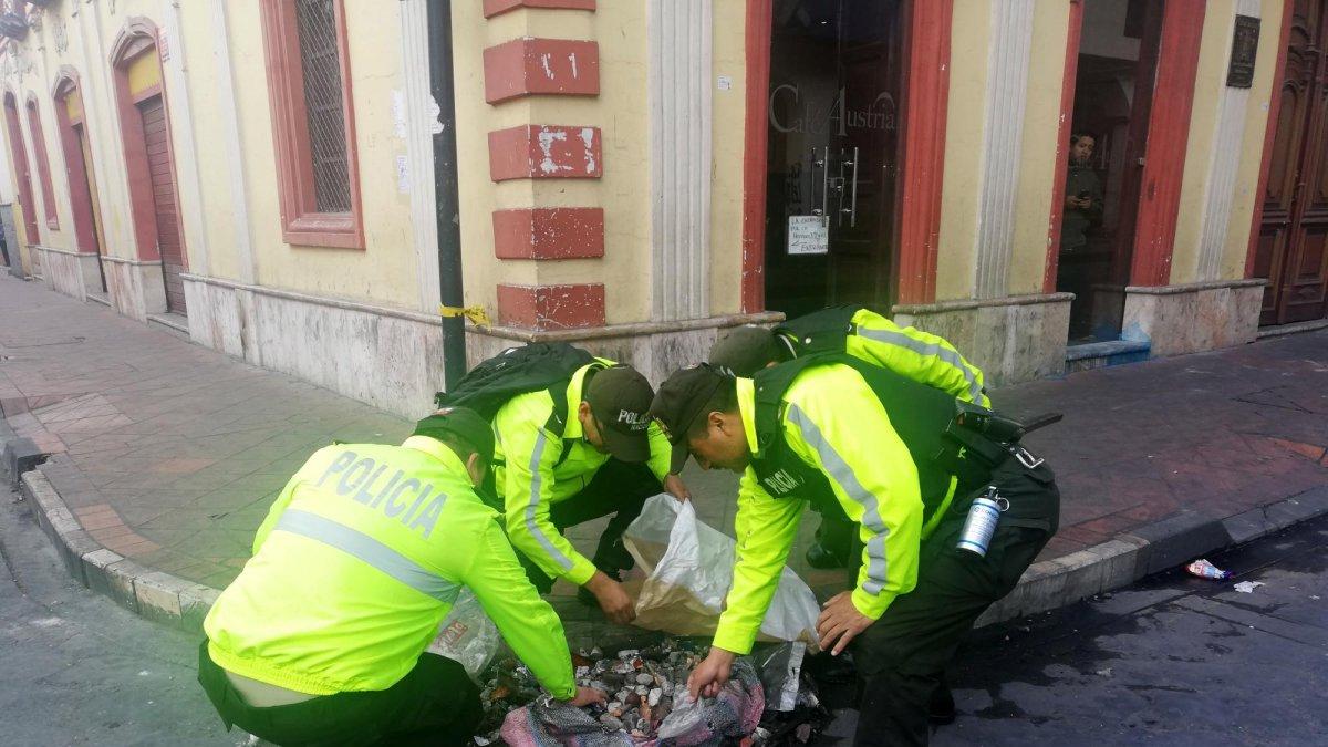 Previo a cercar las inmediaciones del edificio, policías retiraron desechos sólidos de las calles aledañas al Centro Histórico de Cuenca.