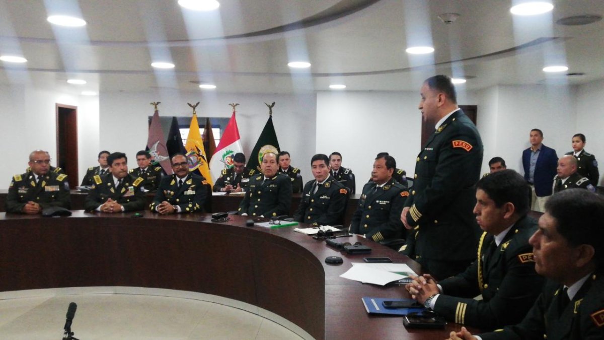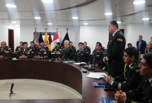 La cita se desarrolla en el octavo piso de la Comandancia de la Policía en el norte de Quito. Encabezan el encuentro los comandantes Nelson Villegas de Ecuador y José Luis Lavalle de Perú.