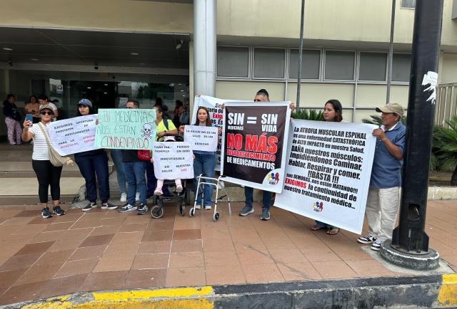 En las afueras de la entrada por la avenida Quito, en el Hospital Francisco de Icaza Bustamante, padres de cuatro niños con atrofia muscular espinal (AME) realizaron un plantón desde las 11:00 de la mañana para exigir respuestas del Ministerio de Salud Pública. La manifestación buscó llamar la atención de las autoridades ante la suspensión del tratamiento médico que los menores recibían cada cuatro meses.