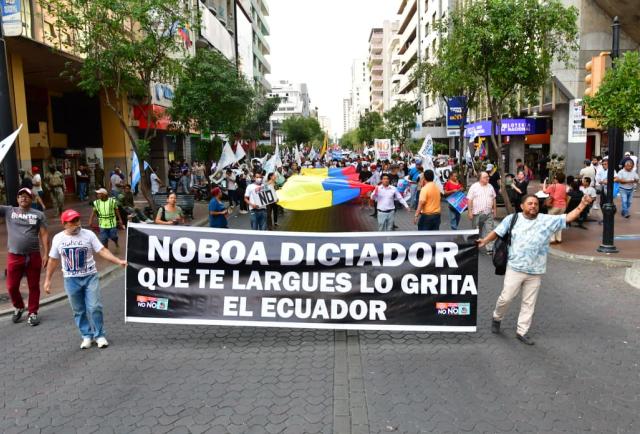 Desde allí, varios vehículos con banderas rojas recorrieron las calles de la ciudad hasta llegar al centro, a la altura del Malecón 2000. En el carro que encabezaba la caravana, Jorge Escala, ex presidenciable y miembro de Unidad Popular, gritaba por el micrófono: “¡Cuatro veces no, cuatro veces no, cuatro veces no… castiga el autoritarismo!”