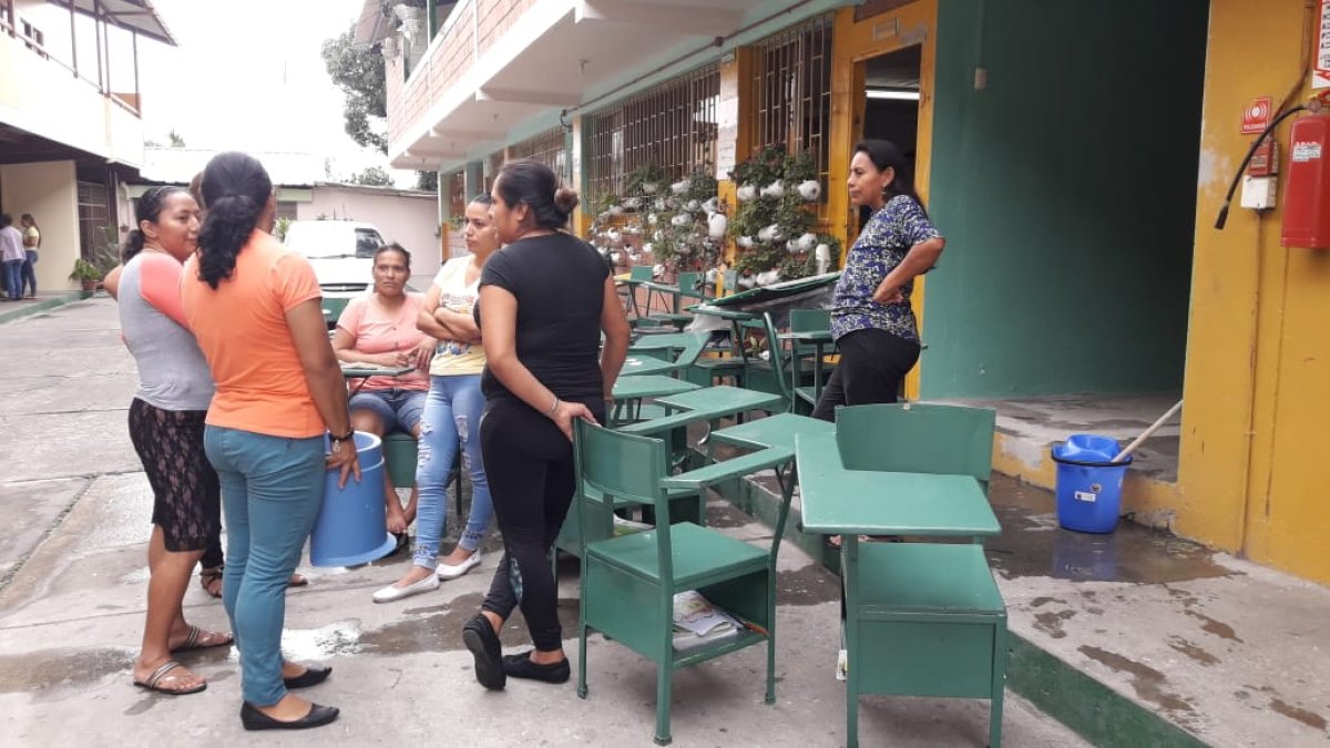 Los padres de los niños iniciaron una minga de limpieza en las aulas. Con baldes con agua, escobas, cloro y detergente comenzaron a limpiar los paralelos y baños. Estos últimos están en pésimas condiciones.