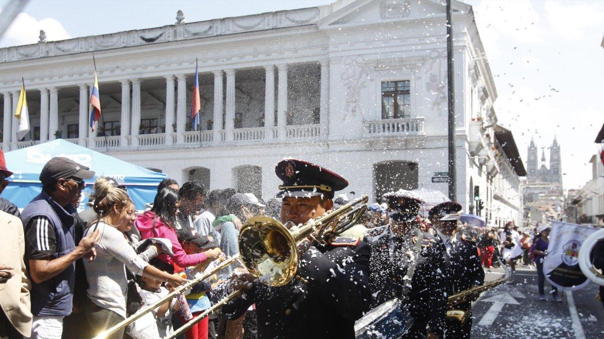 Desde la iglesia La Basílica, en Quito, salieron grupos de comparsas y músicos para encender un carnaval que intenta llevarse a lo cultural, inculcando el respeto a los demás, sin echar agua y jugar solo con espuma. Un grupo de músicos recibe un baño de espumas de parte de los espectadores.