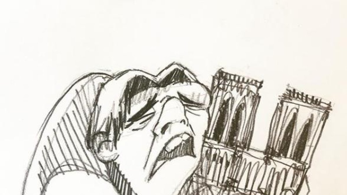 La guayaquileña Cristina Correa Freile, de 38 años y arquitecta de profesión, dibujó este lunes 15 de abril de 2019, un Quasimodo abrazando la catedral de Notre Dame con tristeza. “Fue una reacción muy espontánea de lo que estaba pasando cuando vi el video del incendio”, cuenta.