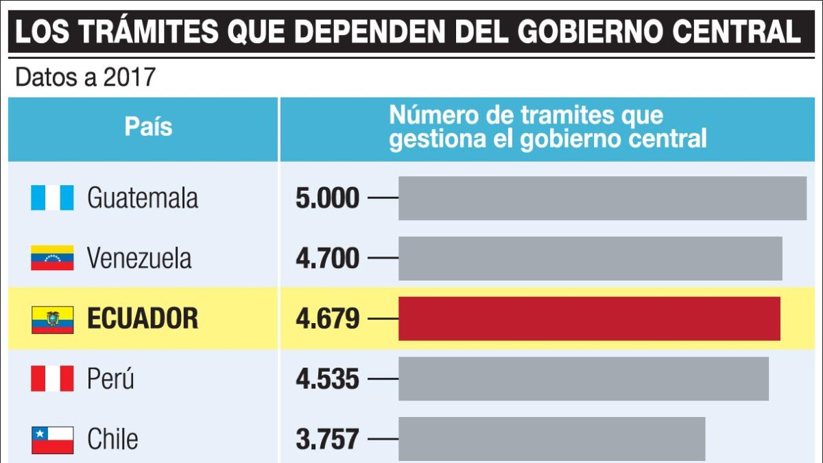 Ecuador encabeza, además, el número de trámites que gestiona el Gobierno central. 4.679 procesos dependen del aparato gubernamental y su burocracia. Solo Venezuela y Guatemala tienen una dependencia mayor (ver cuadro).