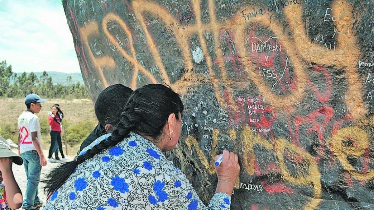 A las 07:00 empezó a caminar. Seis horas después llegó a la meta que se había propuesto. Su nieto Marlon fue el primero en pisar la tierra del sitio considerado sagrado. Se arrodilló, elevó oraciones y luego anotó su nombre en la piedra, con eso motivó a su abuelita Cruz María a que lo imite.
