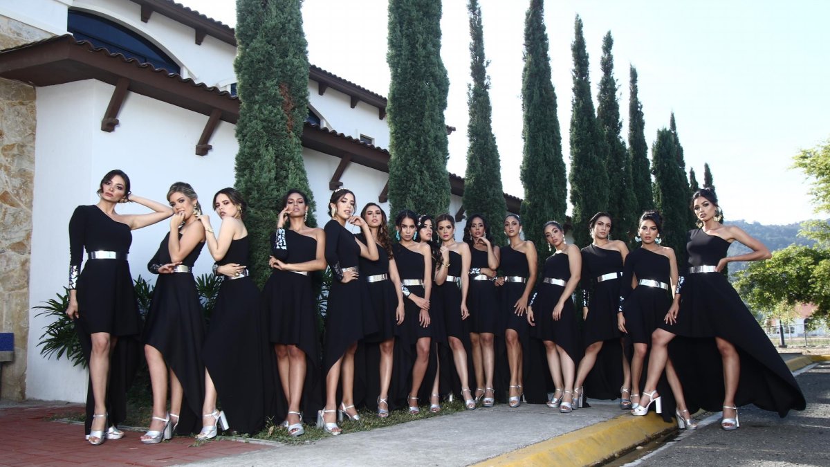 Para esta producción fotográfica, el diseñador ecuatoriano Eduardo Villamar creó un atuendo especial para las candidatas, de estilo versátil e inspirado en su nueva colección. “Sin duda, estos trajes tienen mi sello. Las 16 chicas usaron el mismo vestido en corte asimétrico, y pude continuar con la experimentación en acetatos, es el toque que tiene en el puño y el cinturón”, explicó el creativo.
