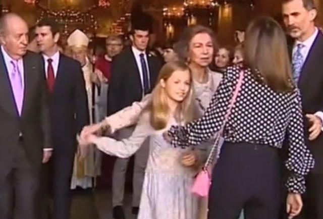 Se observa cómo la esposa de Felipe VI se acerca a sus hijas y a su suegra para decirles algo y toca el pelo a Leonor, Princesa de Asturias y heredera de la Corona española, que en ese momento aparta de su hombro la mano de su abuela.