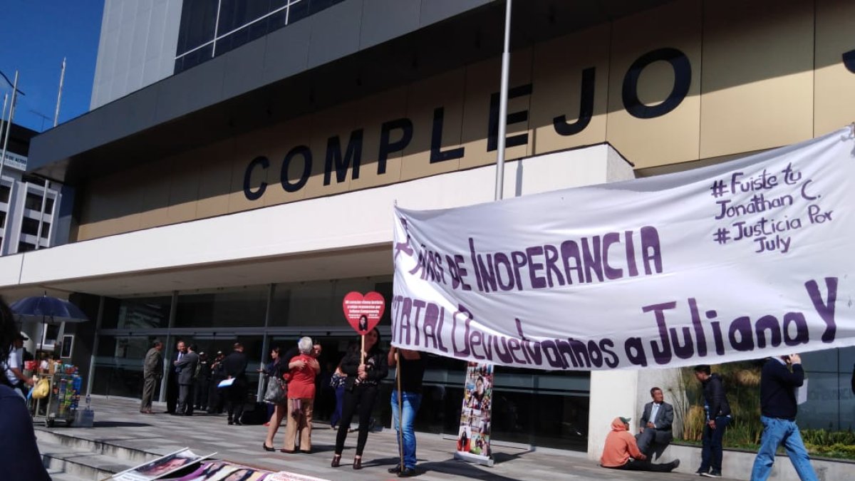 Previo a la diligencia, los familiares y amigos de la víctima acudieron a los bajos de la plataforma judicial del norte de Quito, para mostrar su apoyo a la causa encabezada por Elizabeth Rodríguez, madre de Juliana Campoverde.